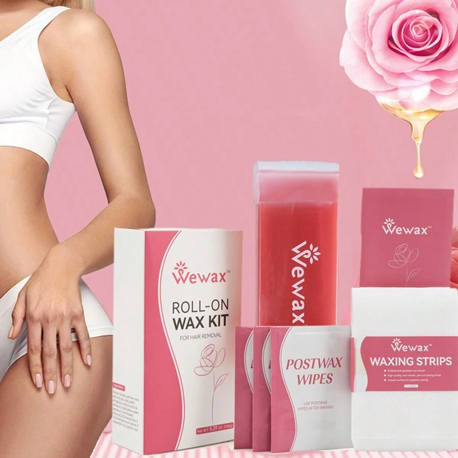 (包括1瓶蠟、15片蠟紙和3片蠟後擦拭片)Wewax蠟滾軸脫毛套裝,玫瑰粉色滾軸蠟,管式脫毛膏,低敏感脫毛套裝,家用脫毛簡單無痛,適用於腋下、胸部、背部、小腿、大腿、手臂、上唇、眉毛和其他身體部位。
