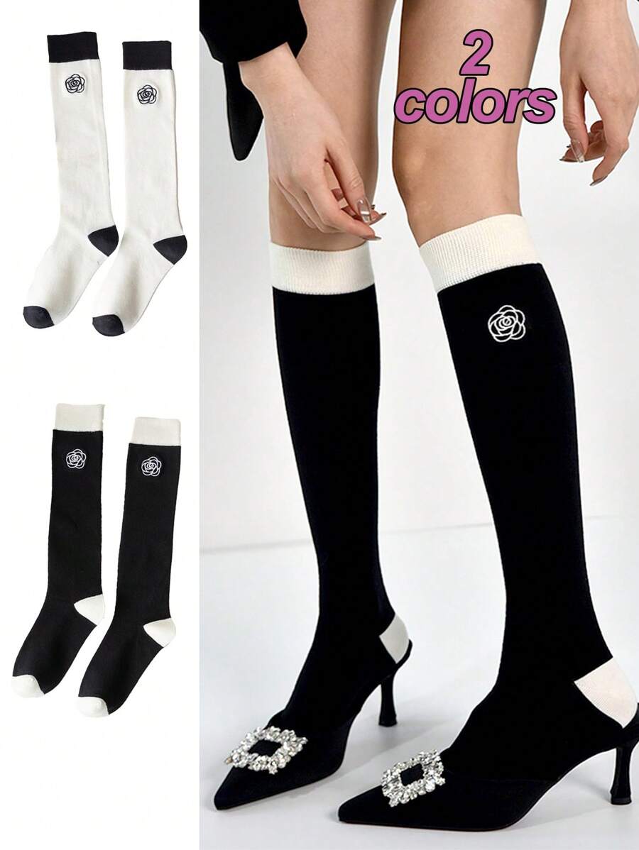 • 1双/2双 法式刺绣山茶花图案过膝袜,黑白配色,Y2K风格,舒适