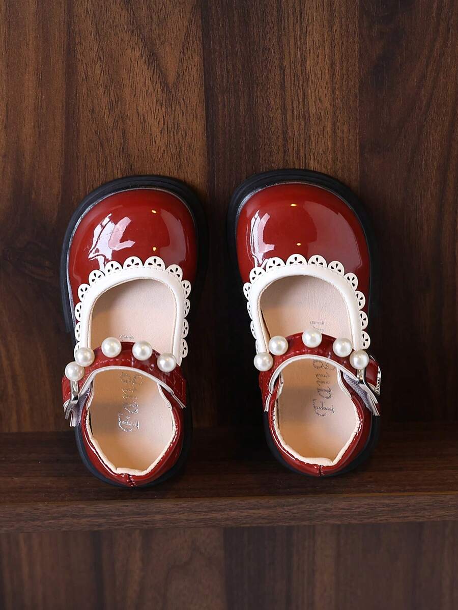 1 双儿童时尚公主鞋,采用 PU 鞋面、防滑外底、钩环闭合、软垫鞋垫、珍珠花边和可调节扣设计