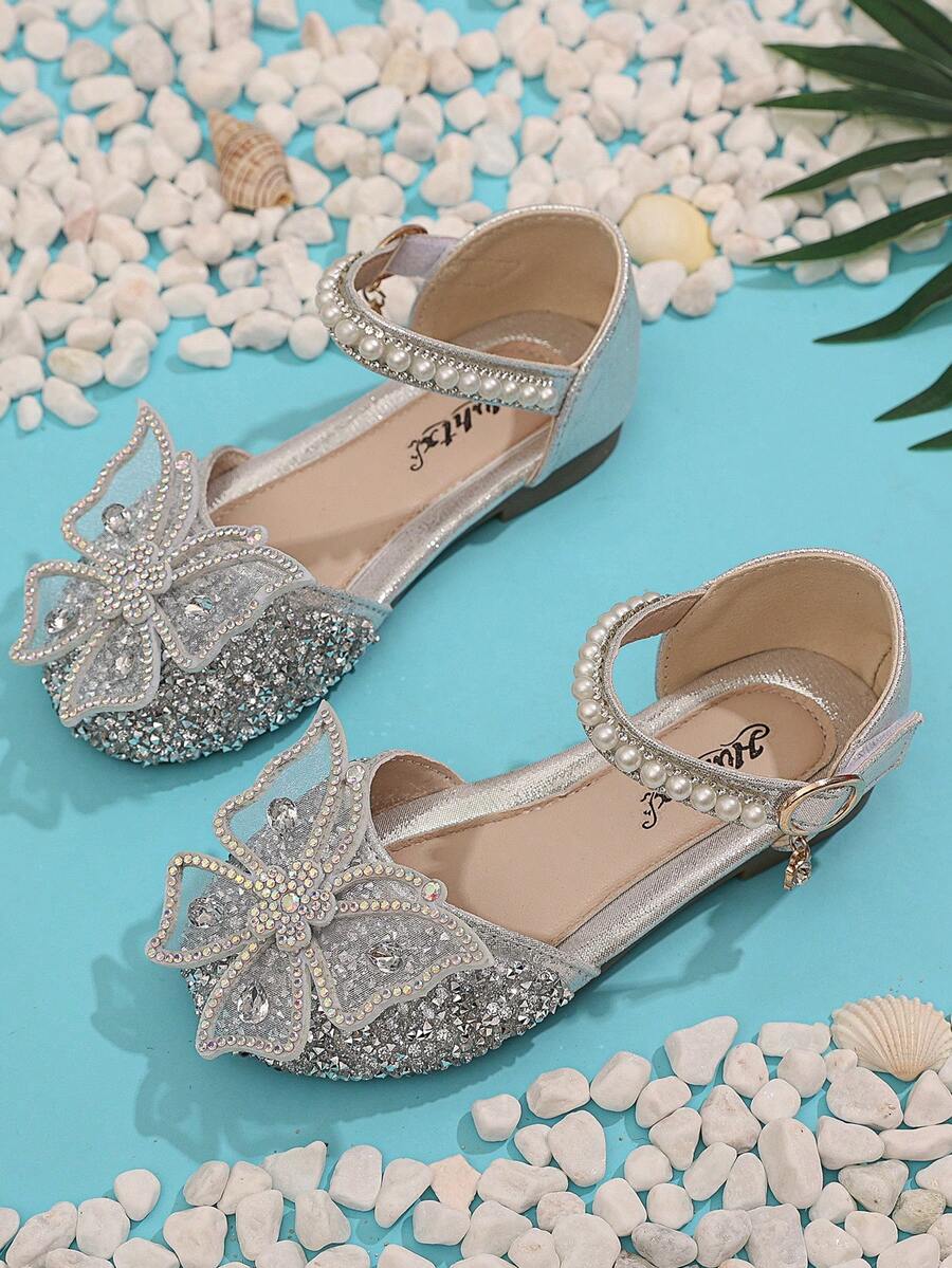 1 双适合小女孩的时尚公主鞋,带仿钻石和蝴蝶结软底凉鞋,水钻婴儿鞋,闪光芭蕾平底鞋