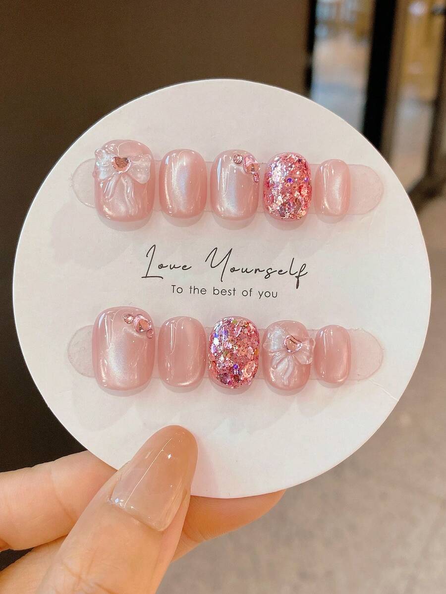 10 件手工美甲沙龙美甲套装,粉色猫眼浮雕蝴蝶结水钻,心形亮片椭圆形指甲贴纸,快速美甲配件工具按压式指甲美甲用品指甲