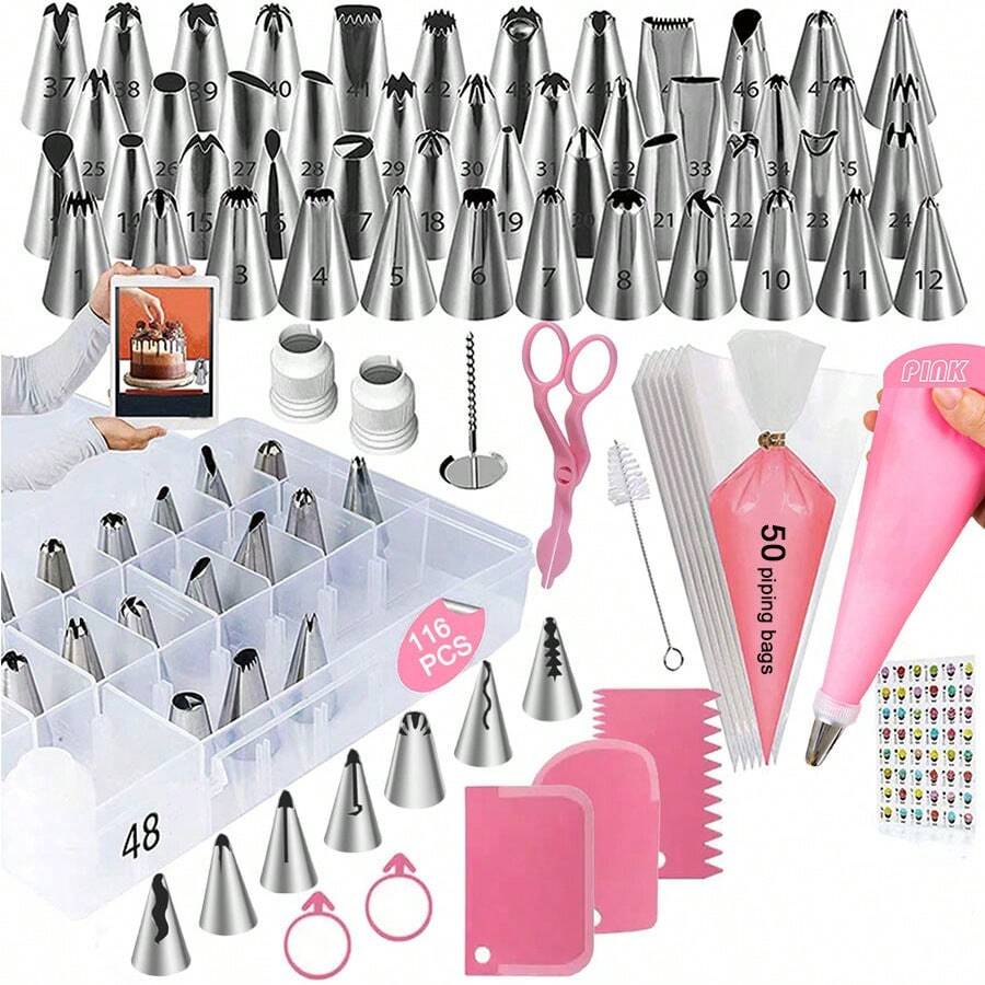 116件蛋糕装饰工具,包含裱花嘴、裱花袋、抹刀等厨房工具,并附赠收纳盒。适用于黄油、糖霜、奶酪、面团、糕点DIY、生日派对、家庭聚会、节日庆典等场合。是烘焙爱好者和专业人士的理想礼物,适合万圣节和圣诞节。