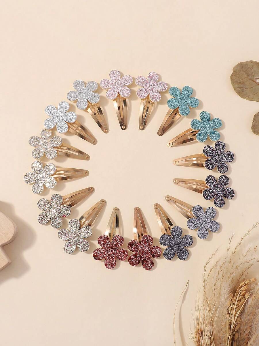 16 件花形闪光发夹,清新花卉设计女孩发饰,马尾辫发夹