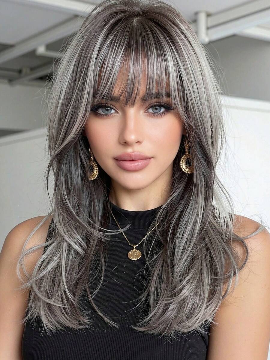 18英寸优雅灰色长卷发假发,带挑染和刘海 - 深色发根至浅色发尾,合成纤维材质,适合女性日常、派对、节日、旅行、万圣节、圣诞节、新年、狂欢节、音乐节、角色扮演等各种场合,是送给女孩的理想礼物,也是夏季毕业季的完美礼物,现成的礼物之选,万圣节圣诞节礼物。