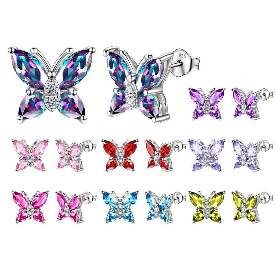 1對優雅藍色的方晶鋯石925純銀蝴蝶耳釘適合女士,節日禮物