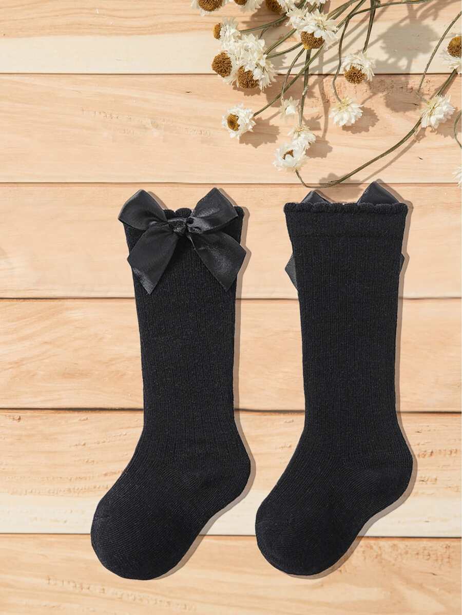 1對女童純色膝上高襪,蝴蝶結裝飾,校園風格