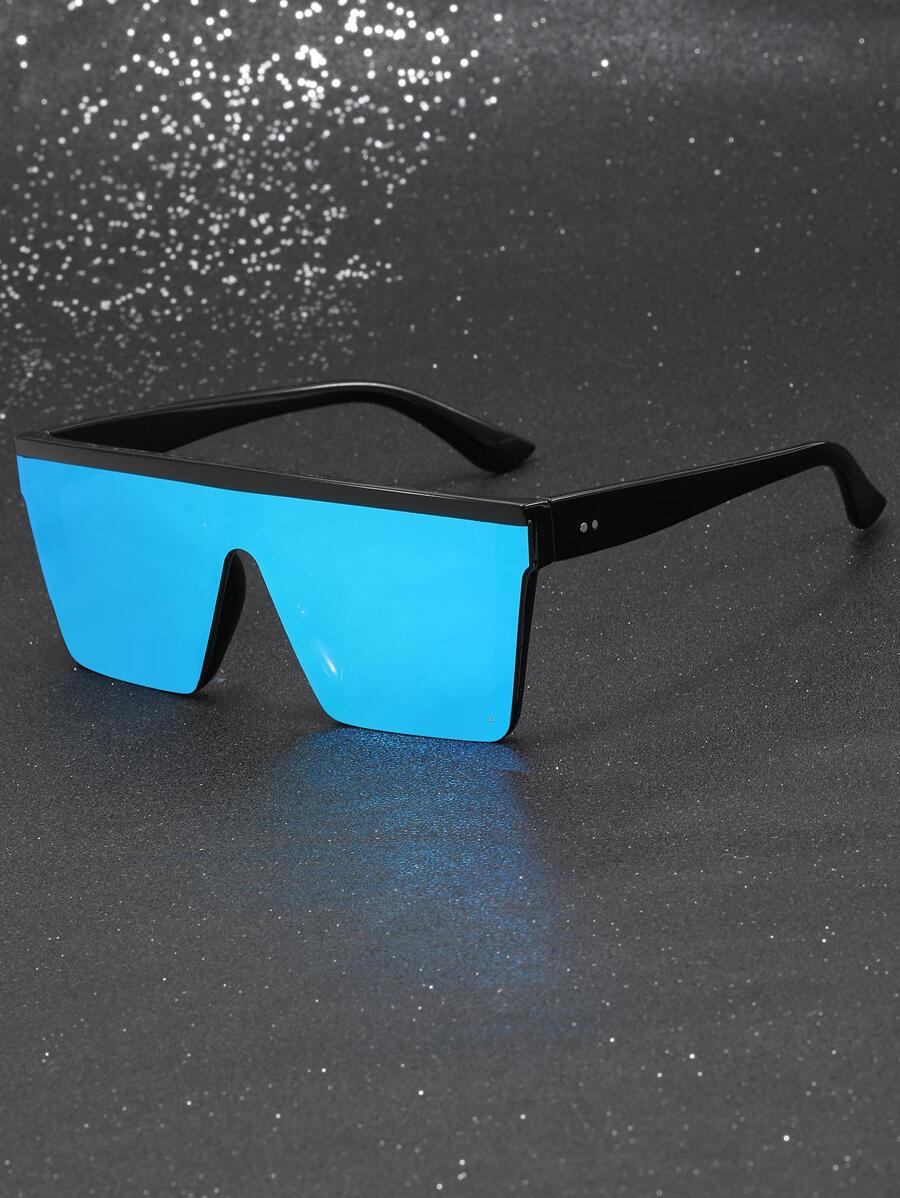 一副男士亚克力几何一体式平顶时尚眼镜,沙滩配饰,打造街头风造型,搭配毛衣、夹克、卫衣、连帽衫、皮裤和工装裤,适合夏季海滩度假、户外活动和旅行。