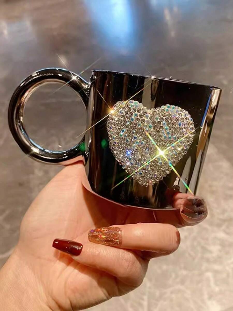 1个200毫升玻璃饮水杯,镶嵌人造钻石,带把手,可盛装咖啡/牛奶/果汁,冷热饮皆宜,圣诞礼物