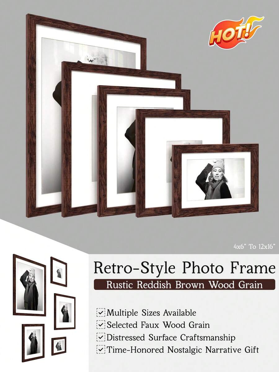 1个5x7/8x10/8x8/12x12/12x16英寸复古风格相框,采用质朴的红棕色木纹,可作墙面装饰,充满怀旧气息,配有衬垫,做旧表面工艺,材质独特,可作拼贴画廊相框,是承载经典怀旧故事的理想礼物。