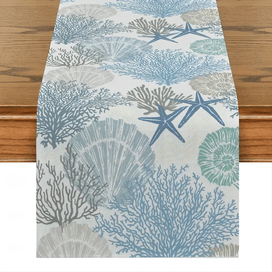 1 件蓝色海洋珊瑚海星设计涤纶桌布、婚礼装饰、现代餐饮桌垫、厨房餐桌装饰、房间装饰