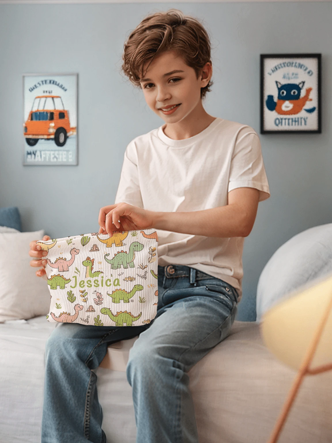 1 件定制名称和卡通恐龙图案灯芯绒洗漱包,外出时存放洗漱用品的绝佳选择,可根据您的独特设计进行定制,适合儿童和青少年,印上您自己的名字或印上您姐姐和同学的名字作为礼物