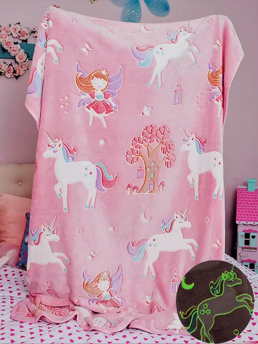 1条可爱夜光独角兽绒毯,柔软粉色毛绒毯,精美圣诞/生日礼物!高品质毛绒毯,饰有蝴蝶和星星图案