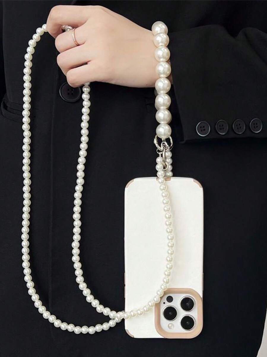 1 件双链白色仿珍珠可拆卸长款斜挎手机链带