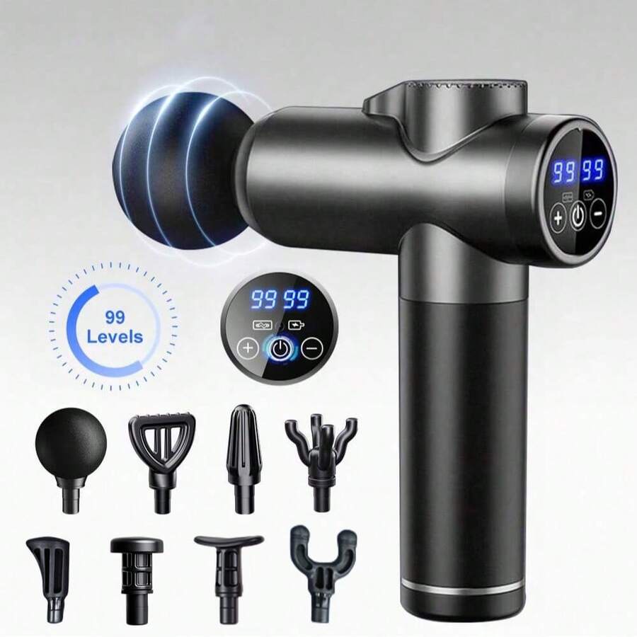 1支按摩枪,深层组织背部按摩器,强力冲击式按摩枪,旅行按摩器,便携式冲击波电动肌肉按摩器,颈部按摩器,99档速度调节,液晶显示屏,8个可更换按摩头,便携式手持健身器材,适合家庭和办公室使用,缓解肌肉紧张