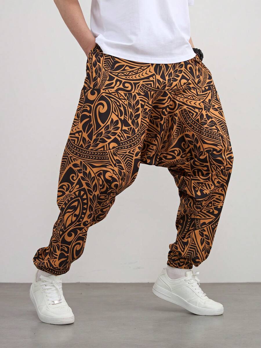 1 件男士宽松休闲哈伦裤,带有叶子元素印花,适合日常和度假,秋季