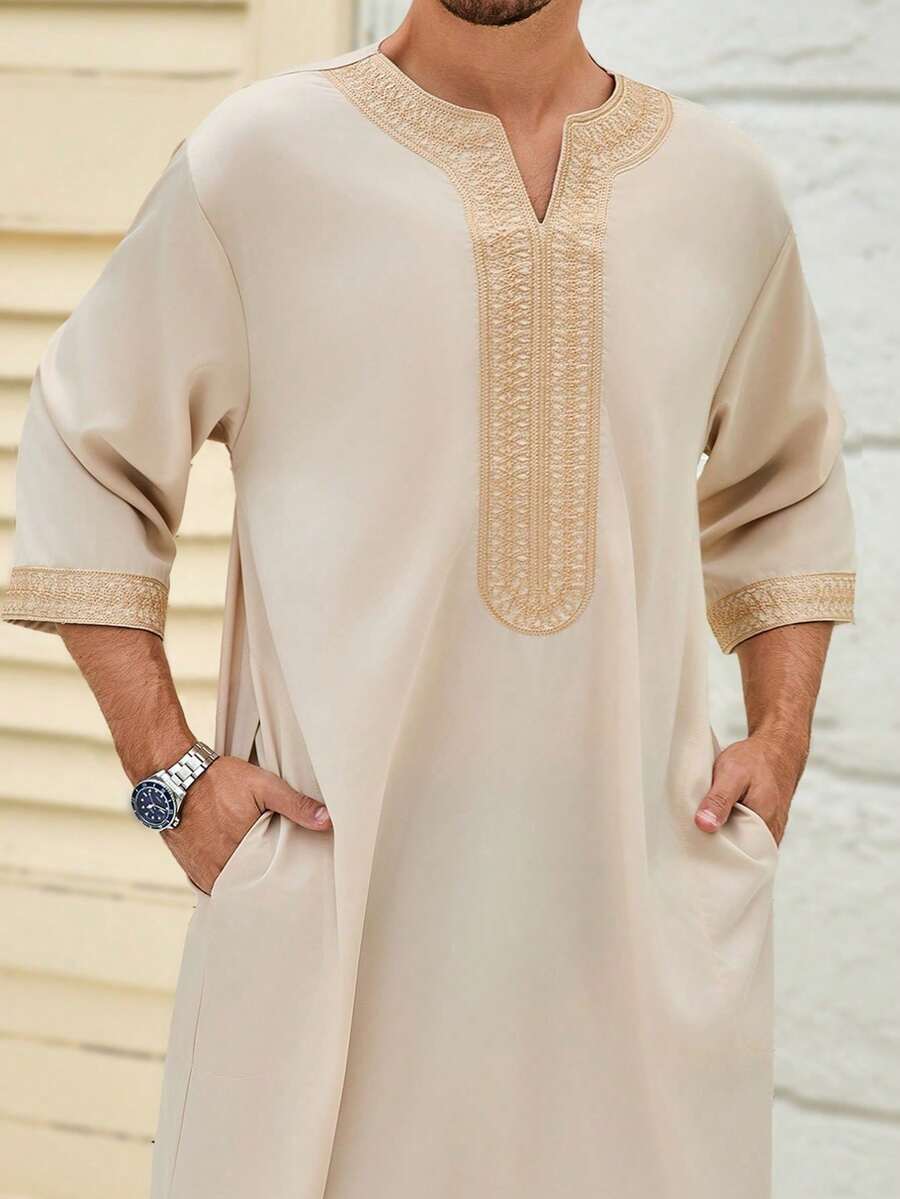 1 件芥末黄色卡夫坦风格刺绣传统长袍,穆斯林摩洛哥男士长袖长袍