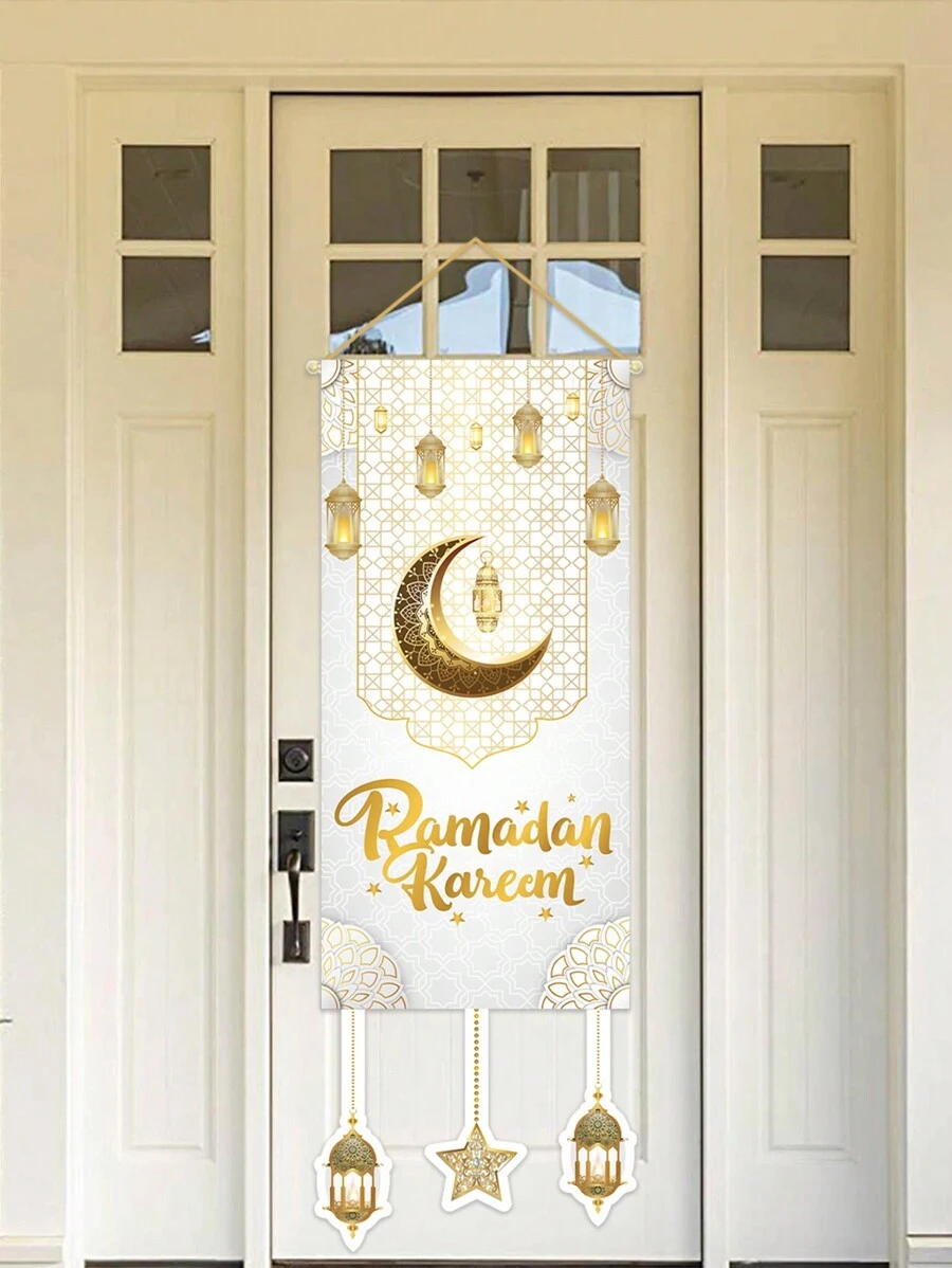 1 件铂金色 Eid Mubarak 斋月 Kareem 悬挂旗帜横幅,缎面材料新月和灯笼图案门帘旗,适用于斋月开斋节家居装饰,2025 年开斋节派对用品