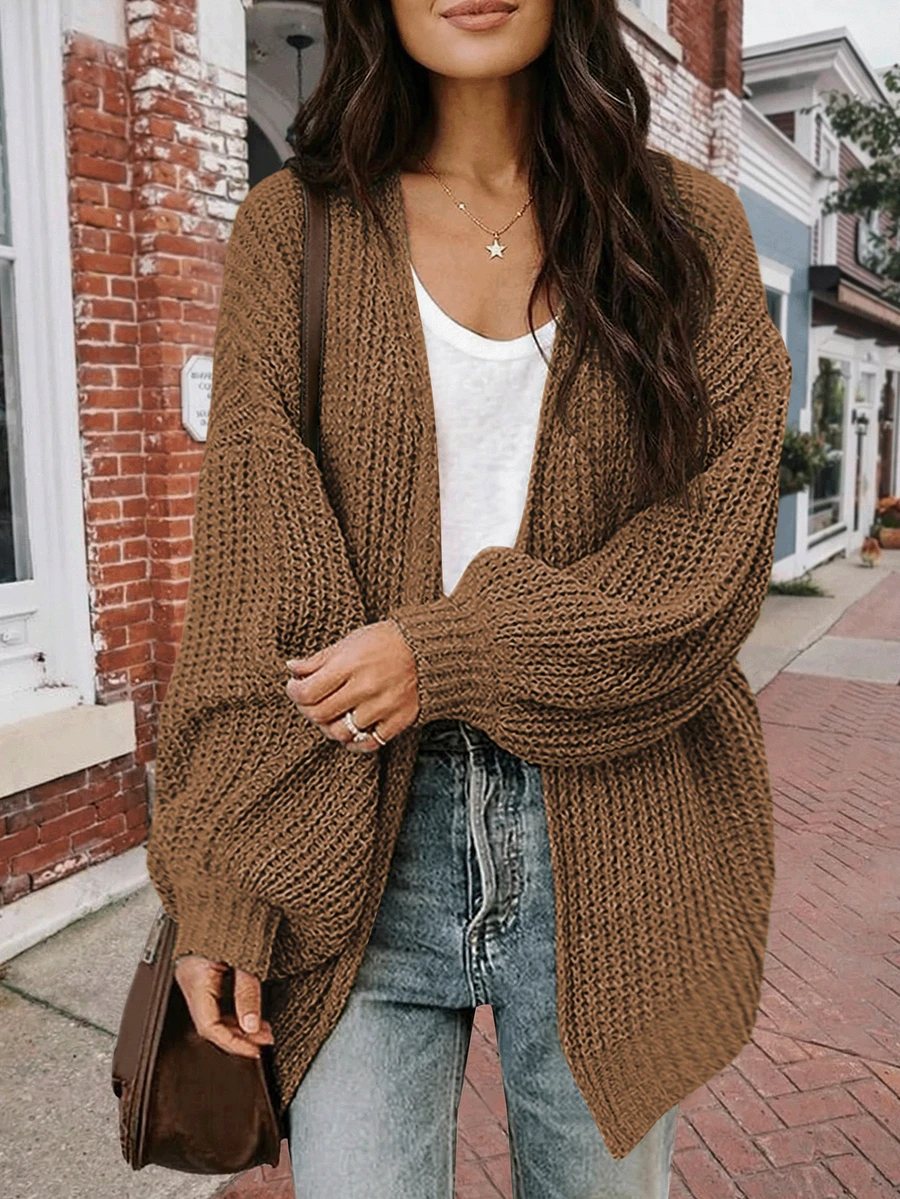 1件女士纯色休闲长袖灯笼袖针织开衫,秋冬季长袖上衣