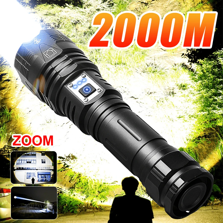 1支超亮350000流明LED手电筒,可充电手持灯,5种照明模式,伸缩变焦,2000米远射程,强力露营钓鱼徒步手电筒,带Type-C快充