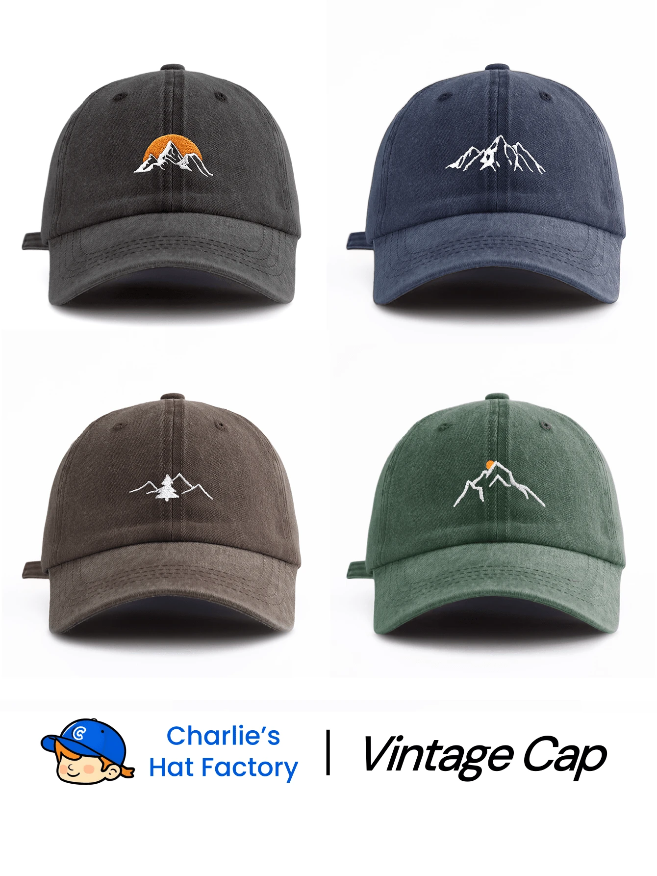 1顶男女通用复古水洗棒球帽 - 高级刺绣山峰太阳图案 - 提供大地色系(黑色、海军蓝、卡其色、绿色、咖啡色)和流行色(酒红色、灰粉色、橙色)可选 - 柔软的牛仔布质感老爹帽,适合户外探险和馈赠