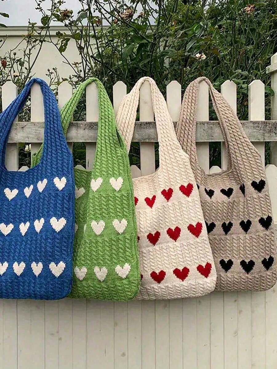 1pc情人节大容量红心针织手提包-女士休闲单肩沙滩包,新款针织心形手提包-甜美风格单肩包,情人节礼物,休闲手提包|可爱设计,夏季,沙滩,购物,多功能通勤包大容量