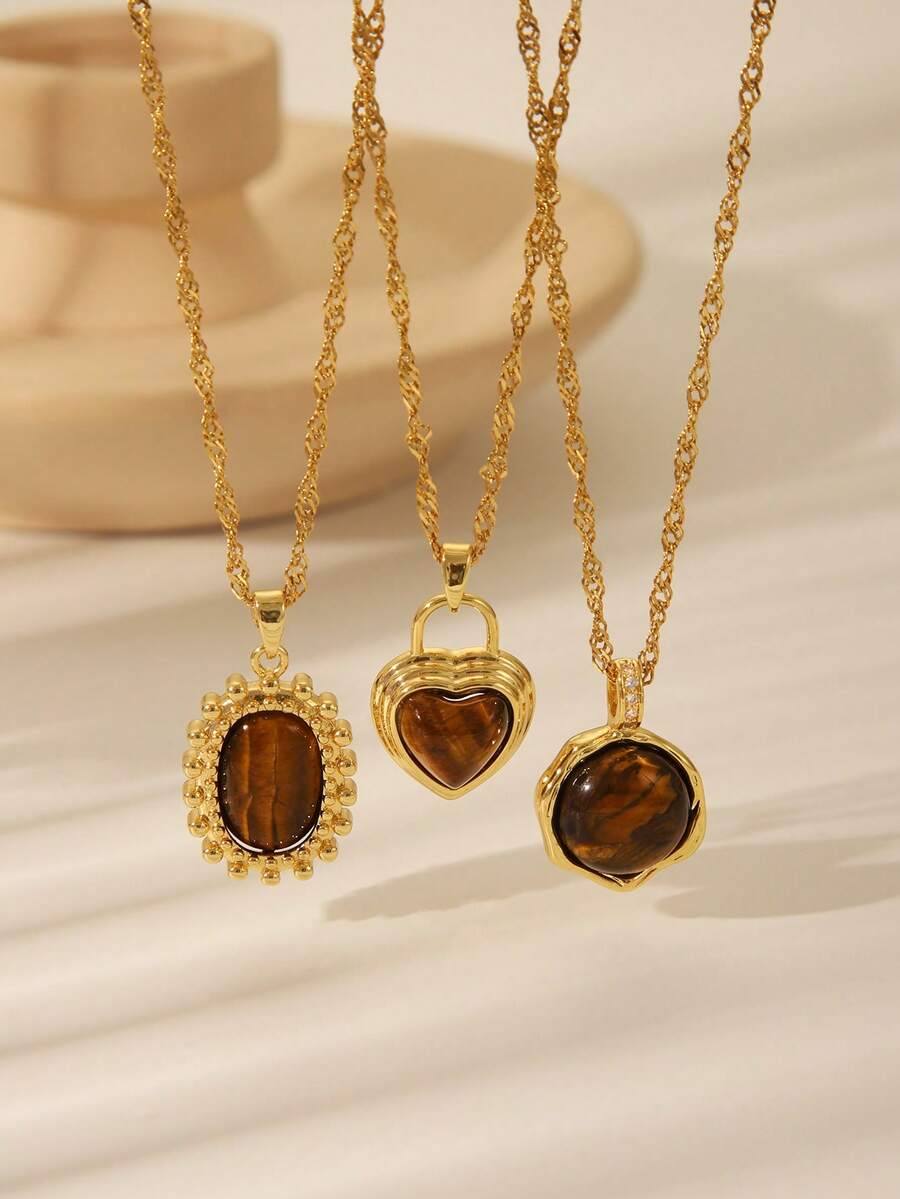 1 件复古棕色宝石不锈钢吊坠项链,椭圆形太阳心形镀金水钻颈链,适合女性日常和节日佩戴或珠宝礼物