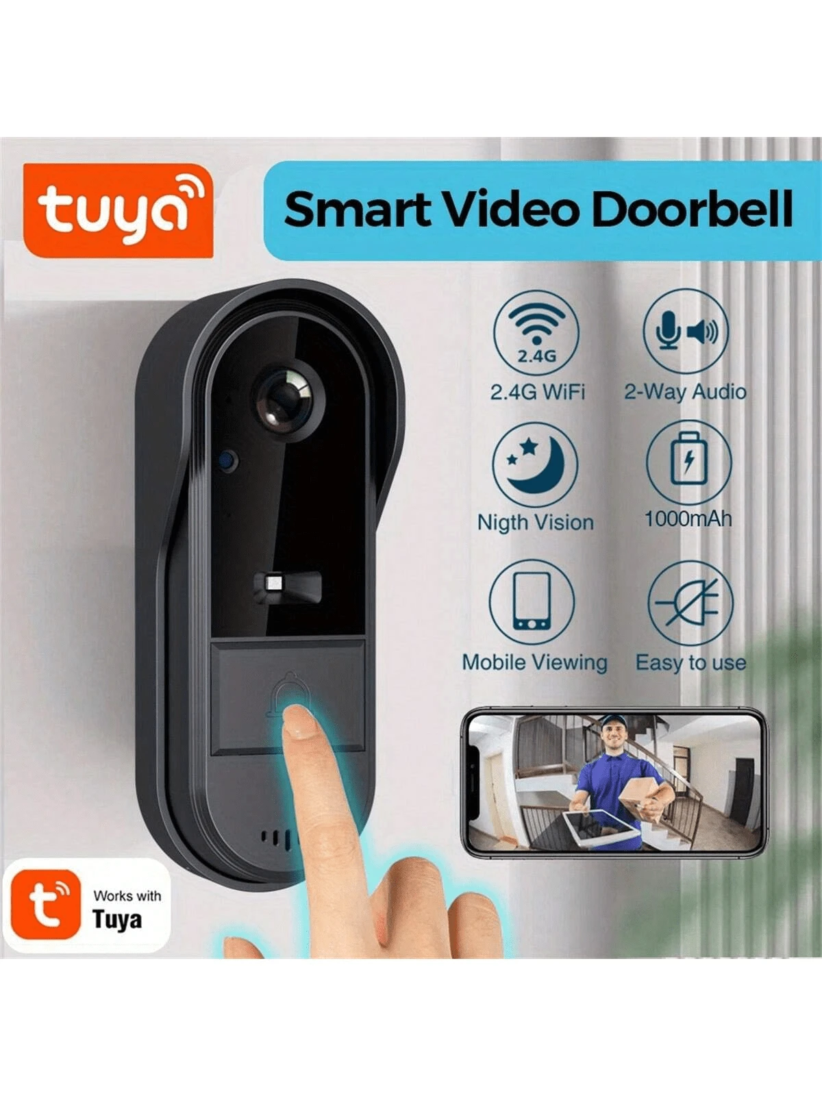 1个无线智能视频门铃摄像头,支持2.4G WiFi、无线对讲、语音转换、双向语音、夜视、远程监控和即时报警功能