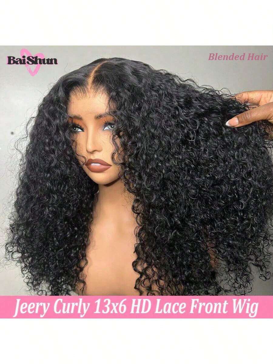 200% 密度 13x6 高清透明蕾丝前假发杰瑞卷发假发人发混合头发预拔婴儿头发女士假发 13x6 卷发鲍勃假发深卷发巴西处女人发混合头发自然发际线轻盈透气 200% 密度自然颜色女士自然发际线自然外观