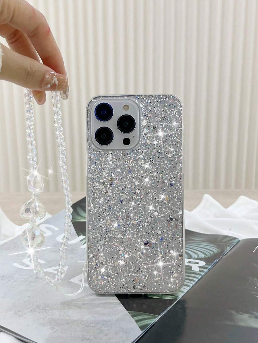 2000 年代时尚手机壳带卡夹银色 Y2k One Galaxy 闪光手机壳带三个心形吊坠和链条适用于 Apple 和 Android 手机适用于女性防水防震防摔防刮