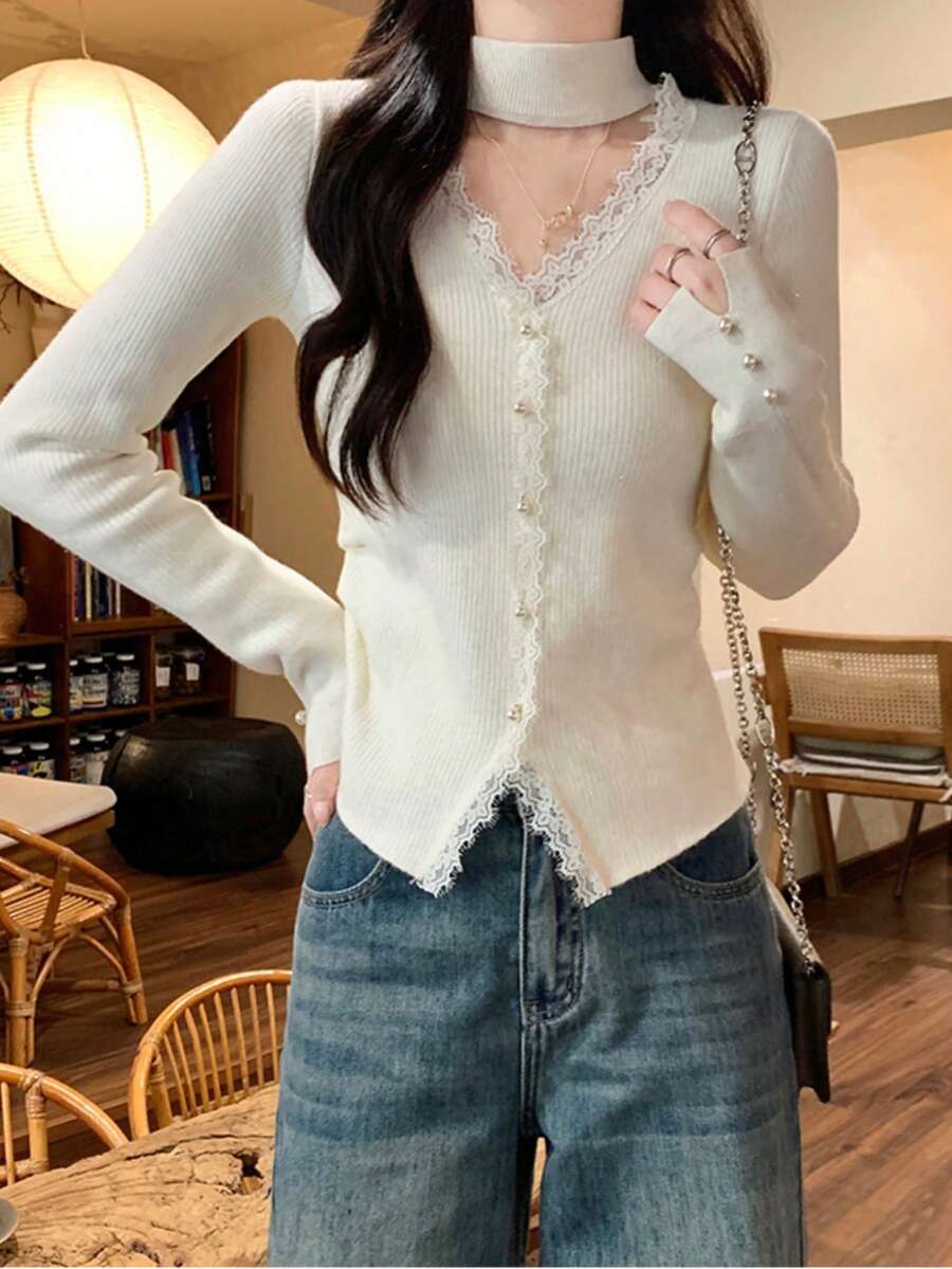 2026 女士蕾丝拼接 V 领长袖针织衫,镂空设计,短款套头衫,春季