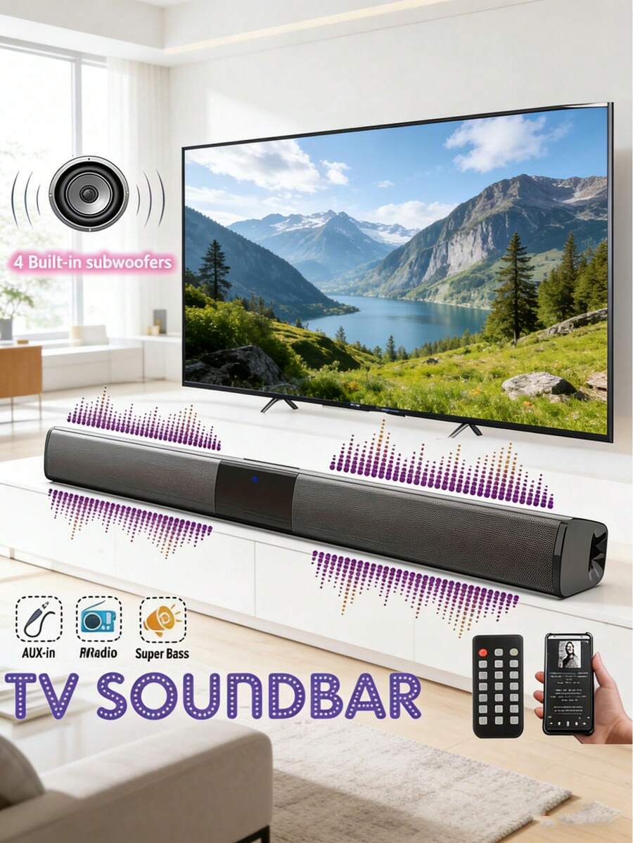 20W 无线环绕音响条形音箱 - 高功率无线扬声器,电视和家庭影院遥控器,可壁挂,支持 Aux、TF 卡、FM 收音机