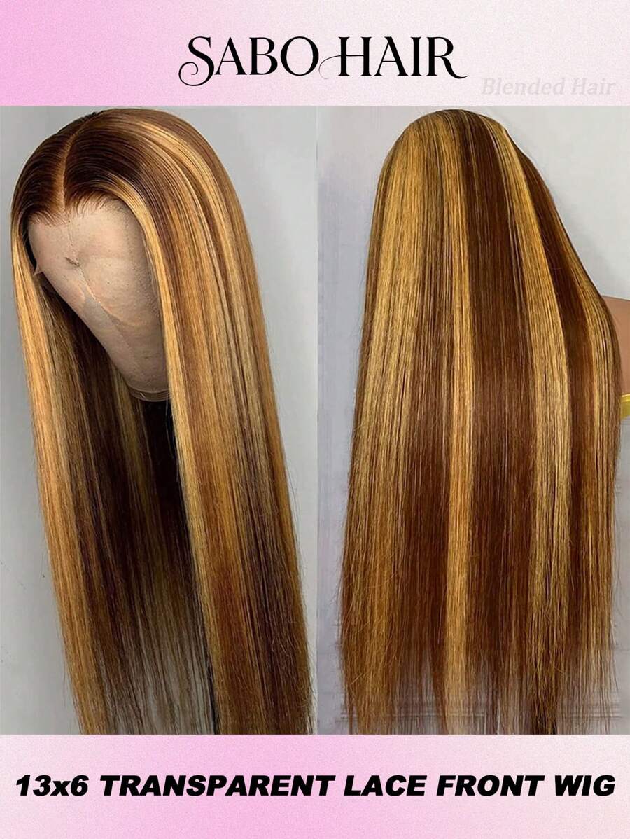 26英寸渐变色13x6高光4/27色透明蕾丝前直发假发,真人前额发丝,高清蕾丝前额假发,预先拔毛,带婴儿发,200%密度,无胶混合发假发,适合女性日常佩戴