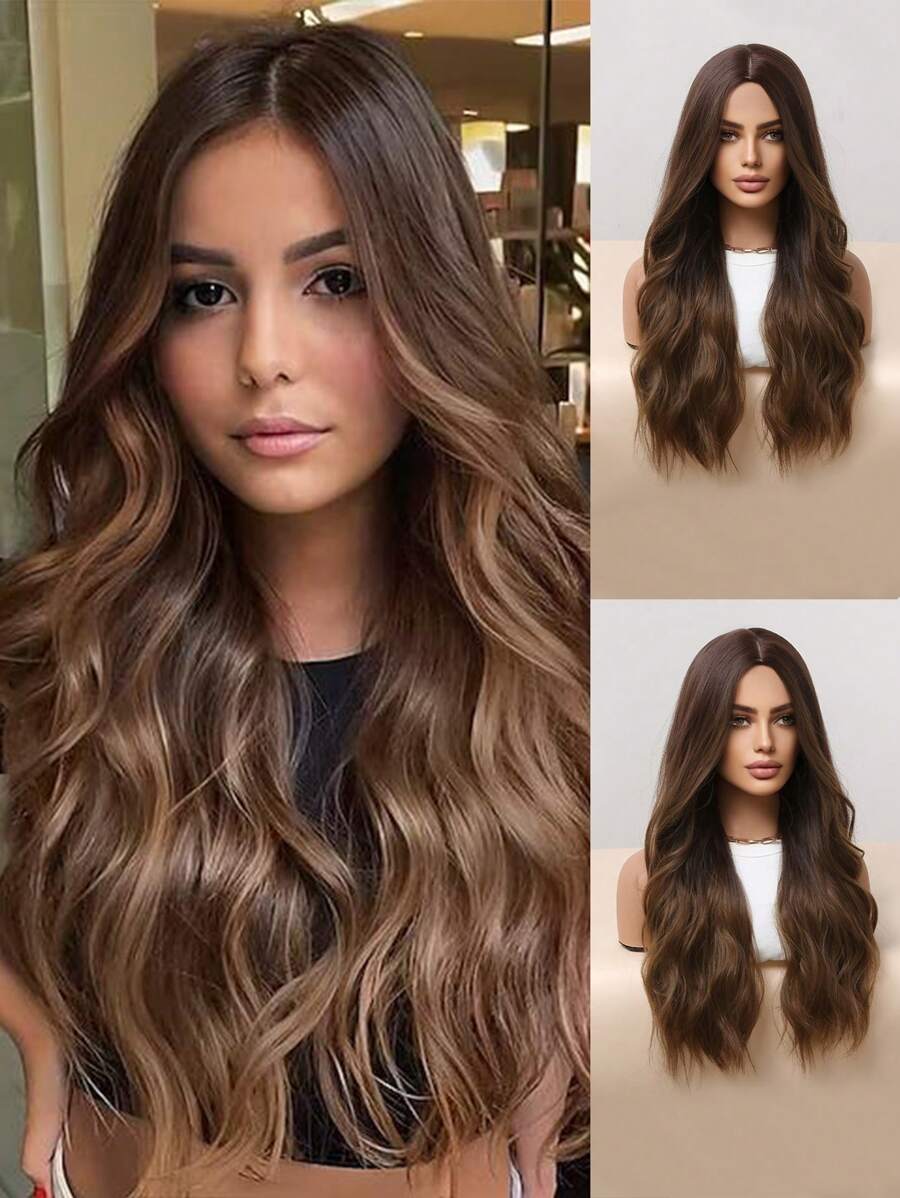 26英寸渐变棕色长卷发合成假发,女士自然棕色假发,中分,耐热合成纤维