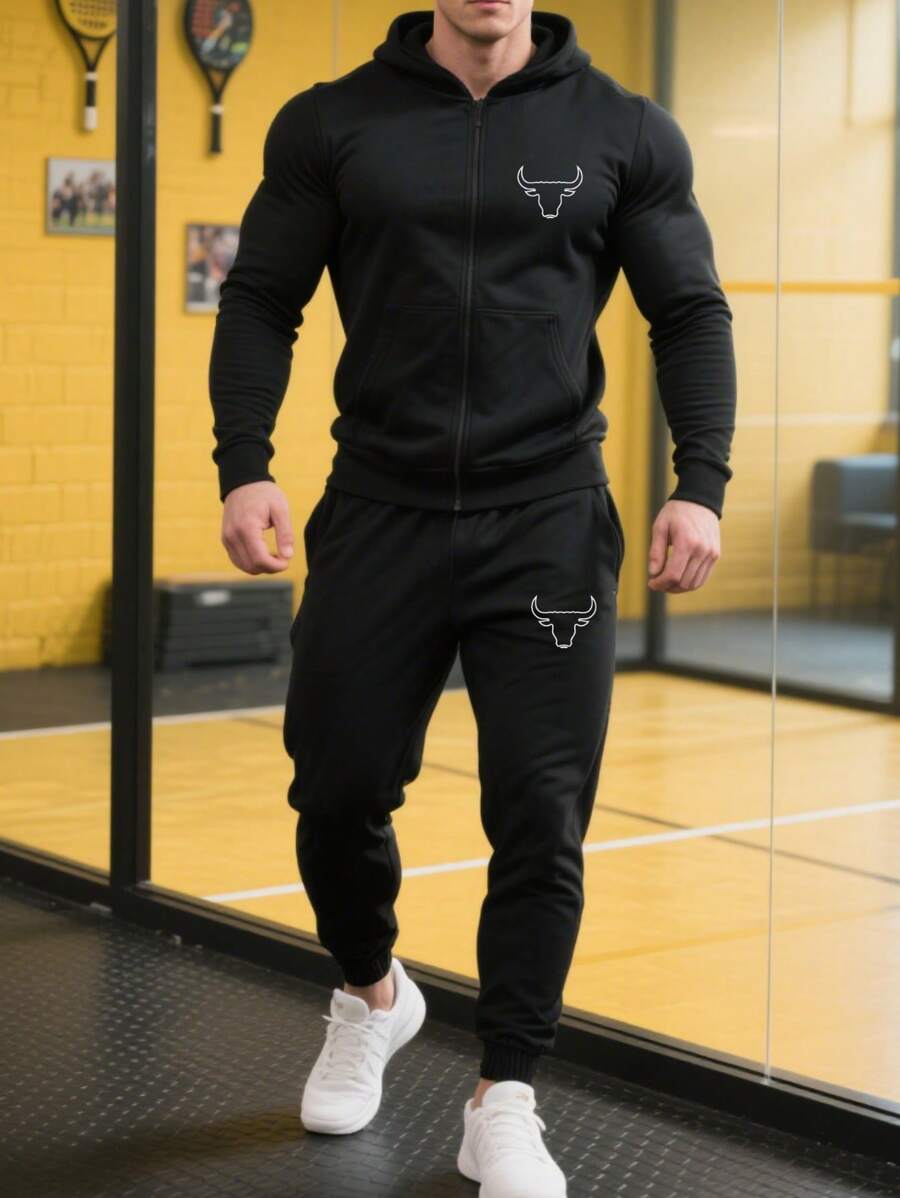 男士运动健身极简印花两件套,秋冬季,黑色拉链连帽衫+紧身裤,公牛图案运动服套装,适合健身房和日常穿着。