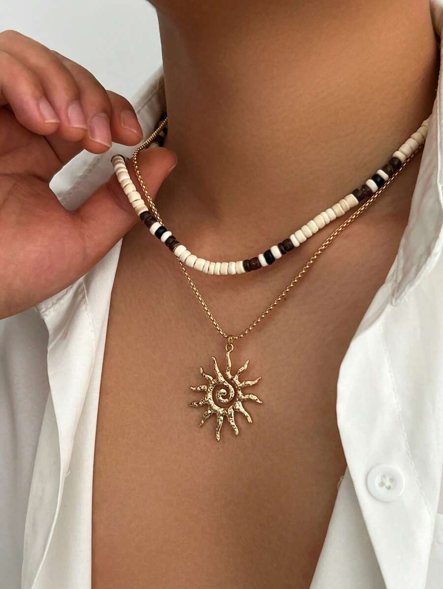 2件套向日葵吊坠和椰子壳串珠波西米亚项链套装男士