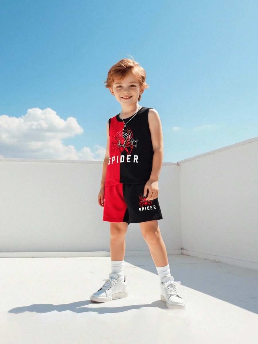 2 件套幼儿男童时尚休闲户外运动蜘蛛图案圆领无袖 T 恤和短裤套装,夏季