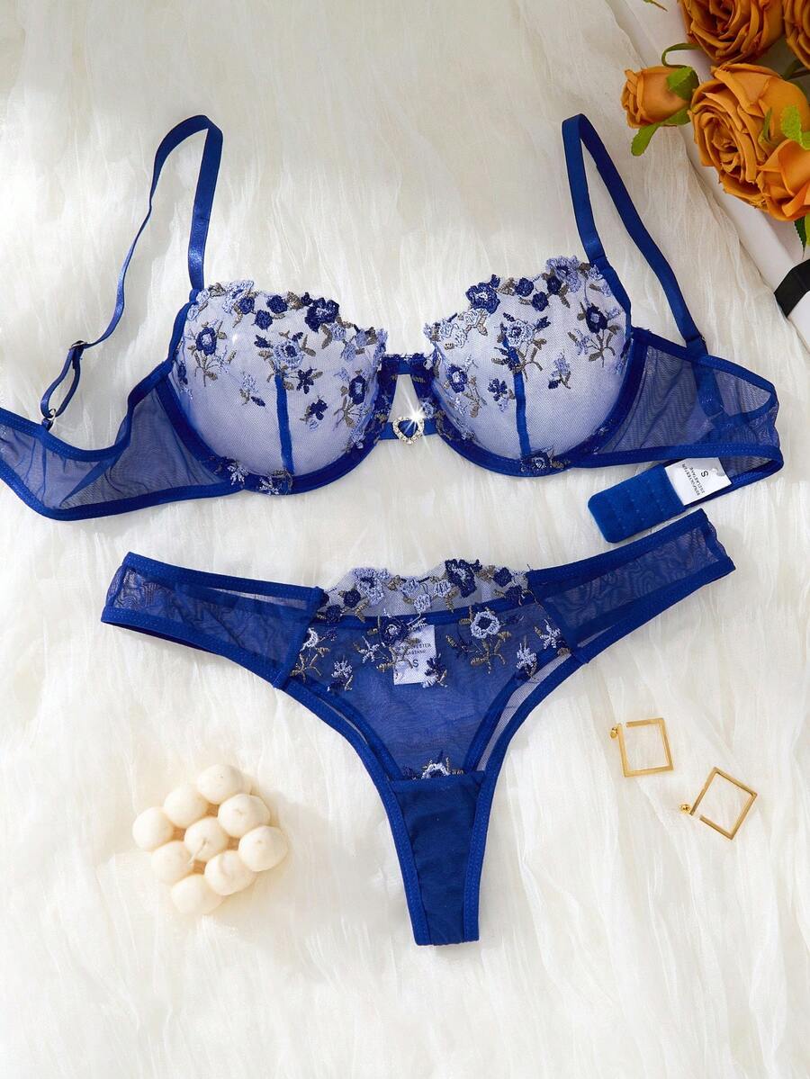 2件套女士魅力优雅刺绣花卉半透明网纱镂空心形装饰内衣套装,舒适家居服风格