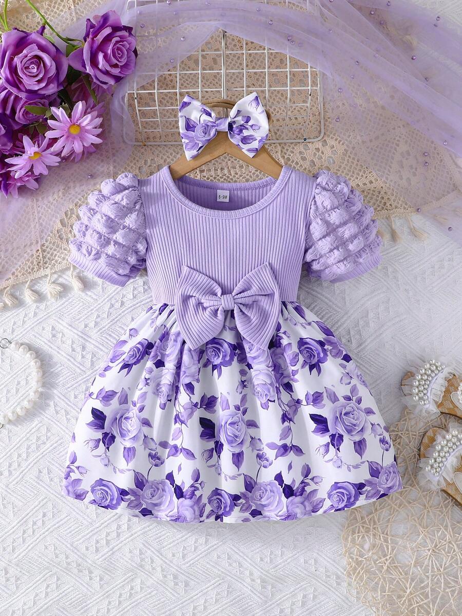 2 件套连衣裙,带泡泡袖、蝴蝶结装饰、花卉图案和头巾、节日派对时尚、春夏