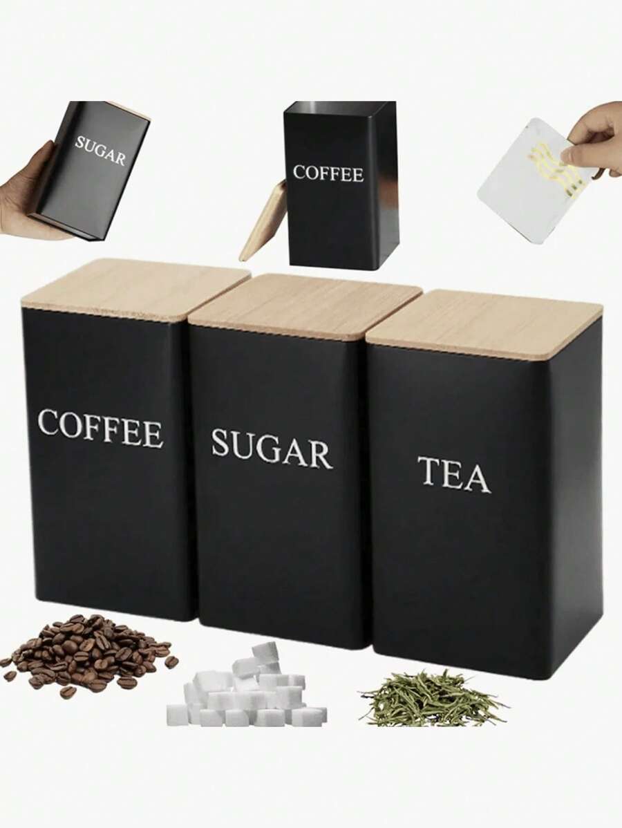 3/1 件装锻铁罐,带竹盖,密封厨房储物容器,用于咖啡、糖、茶 - 方形马口铁密封罐,用于整理和食品储藏室展示、厨房储物、食品储藏、房间装饰,适用于厨房、餐厅、派对、露营、聚会、送给朋友、家人的礼物、返校用品