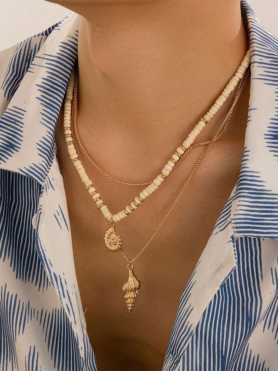 3 件套男士夏季椰壳和贝壳串珠项链,时尚百搭金属扁平蛇链项链,适合休闲、派对和礼物