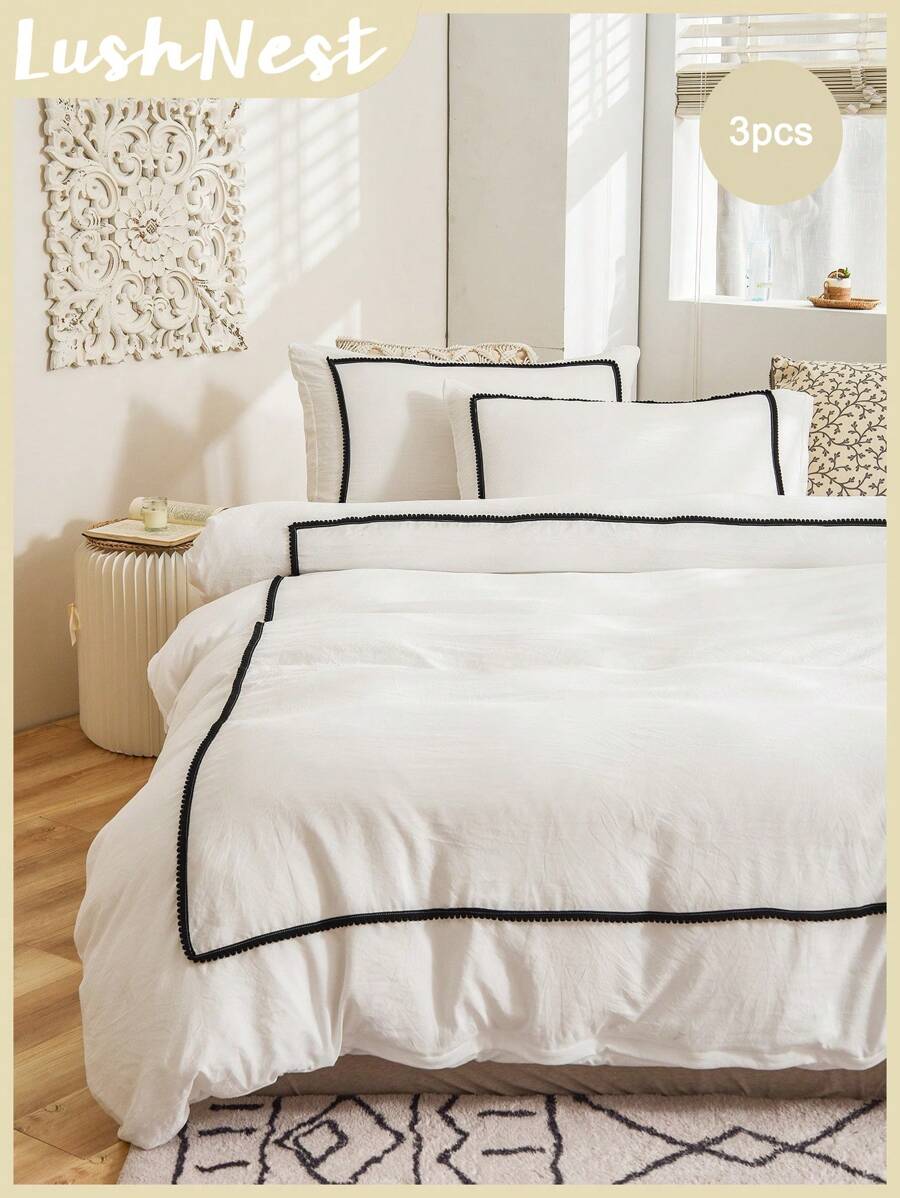 3件套波西米亚风白色床上用品套装,饰有可爱的黑色毛绒球,复古别致的被套套装