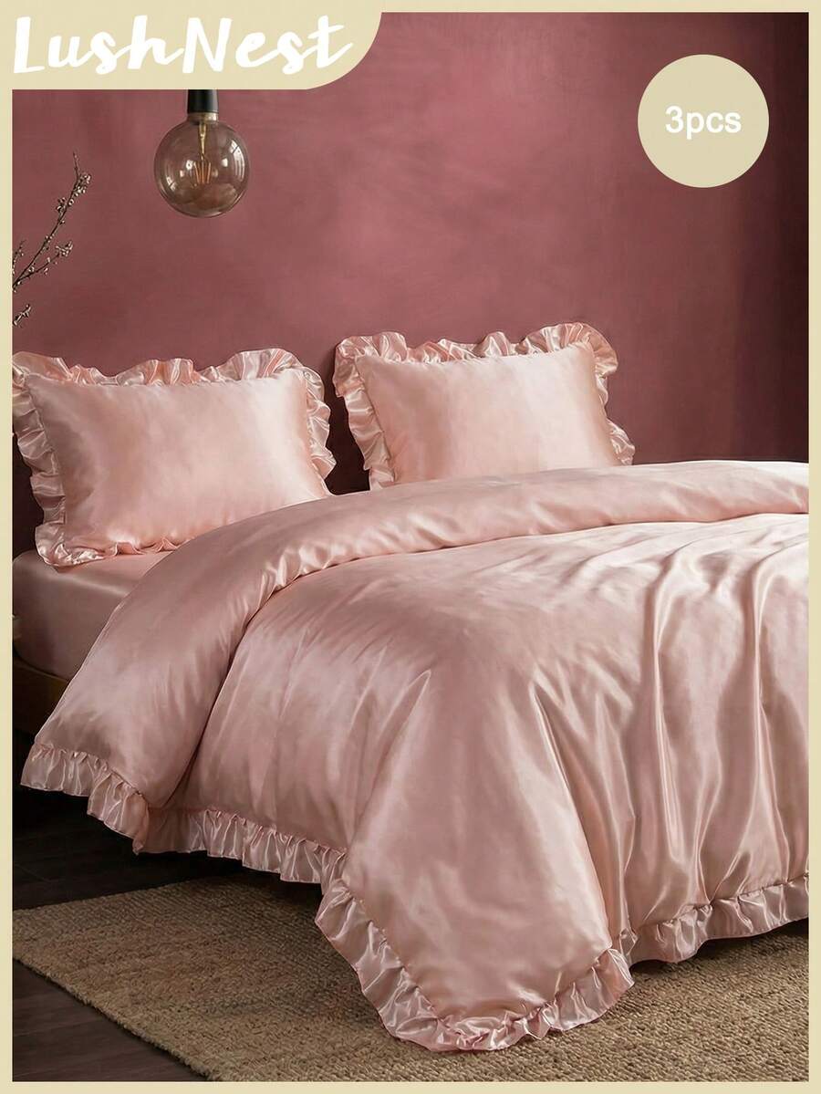 三件套缎面纯色床上用品套装 - 包括被套和两个枕套,丝滑涤纶面料,透气耐用,缎面质感,奢华触感,简约优雅