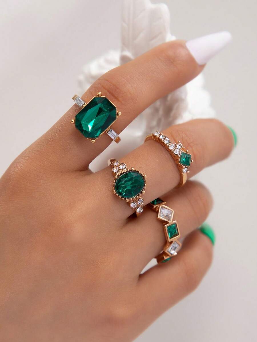 4 件套简约时尚水钻镶嵌几何创意小众女士珠宝戒指套装,适合日常佩戴和任何场合的完美礼物