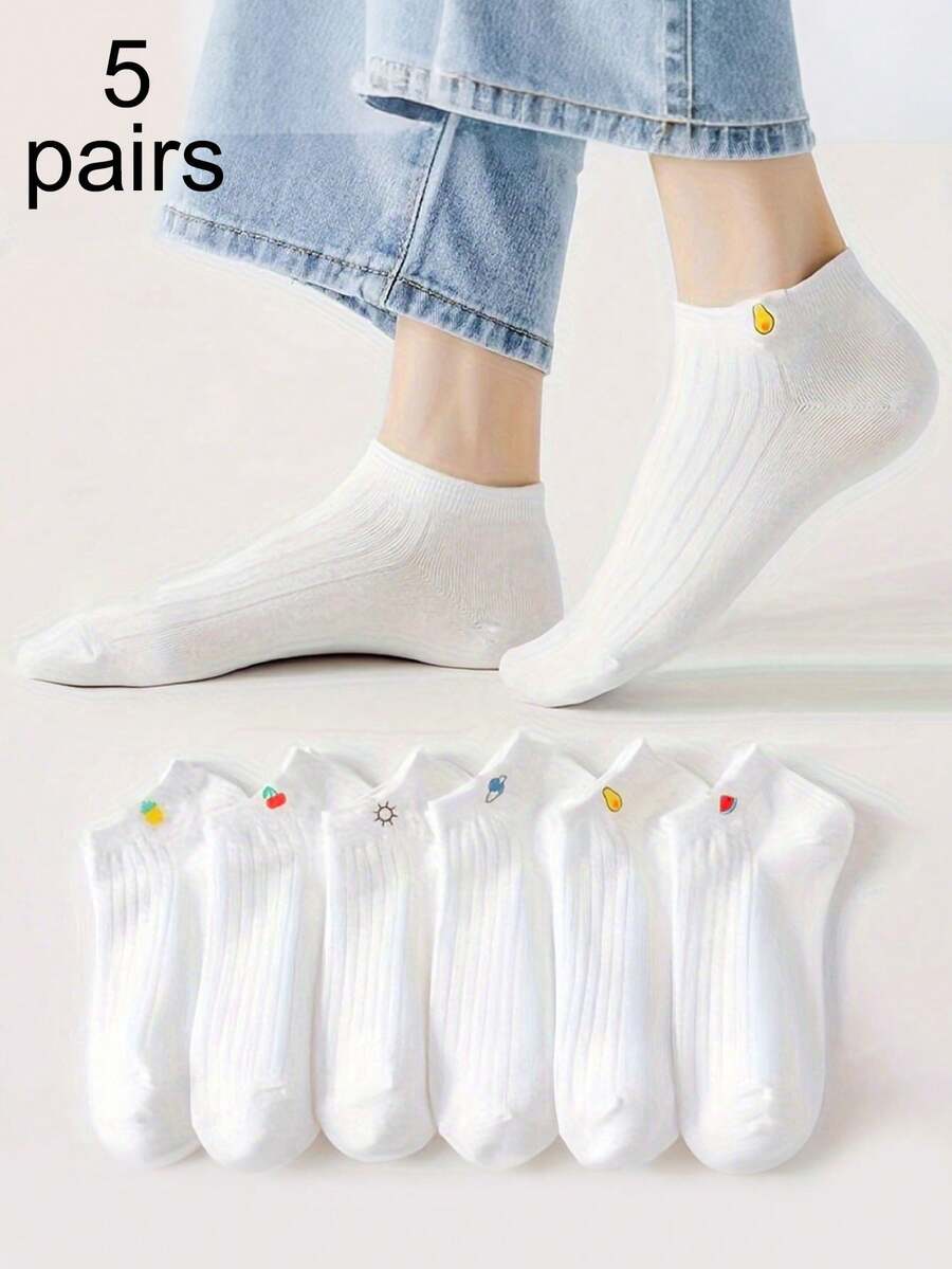 5双随机白色女士简约休闲袜子,卡通水果图案,适合日常穿着