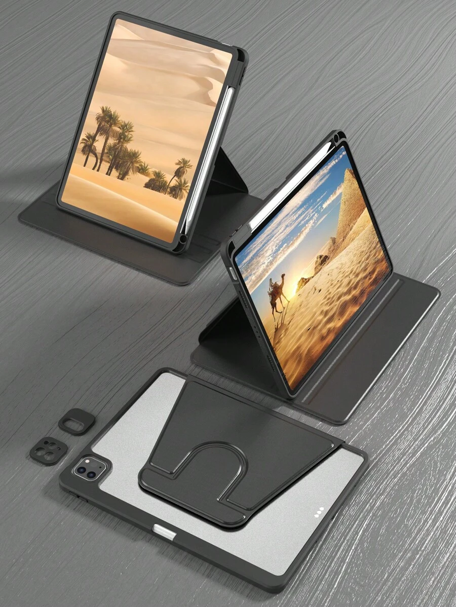 60°旋转平板电脑保护壳后盖,防震、高抗压、防刮擦,支持睡眠/唤醒功能,兼容内置Apple Pencil插槽,可调节视角 - 黑色,适用于iPad