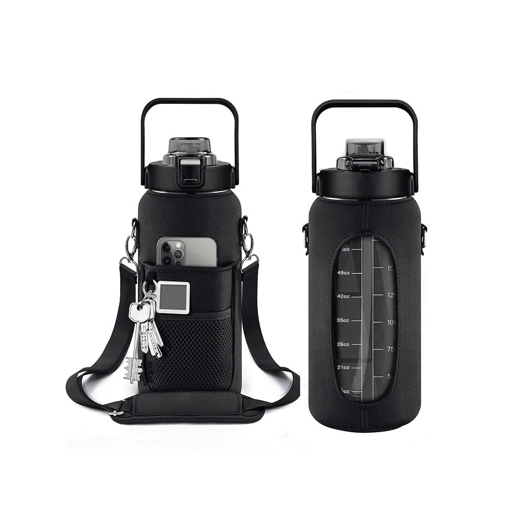 64盎司/1/2加仑水瓶,带瓶套和吸管,大容量运动水瓶,带有激励时间刻度,防漏,配有肩带,适合健身房和户外活动