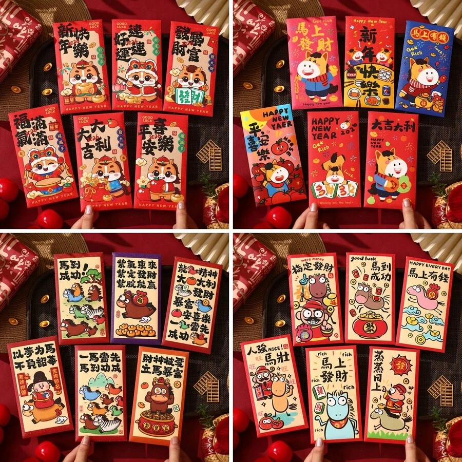 6个2026马年中国新年红包(款式随机),象征春节期间的成功和好运,唐人街新年压岁钱红包,中国节日红包,圣诞节礼物红包