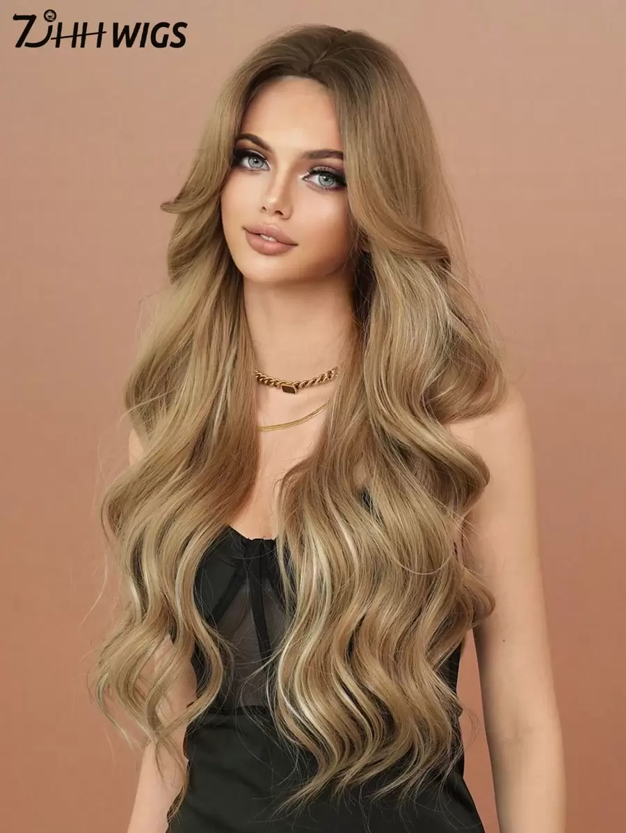 7JHH WIGS 挑染棕色超长卷发假发混合金色中分超长波浪假发合成纤维假发适合日常派对使用 32 英寸