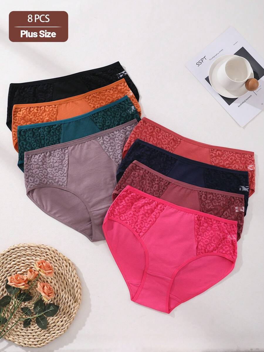 8件装女士加大码内裤中腰无缝三角裤性感蕾丝拼接舒适运动内衣收腹提臀弹力内衣