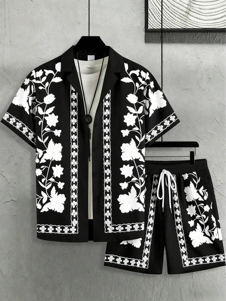 AICJ 男士印花睡衣两件套 - 短袖衬衫(带领和口袋)、抽绳短裤、针织面料,适合春夏、度假/海滩穿着,也可作为男友生日礼物
